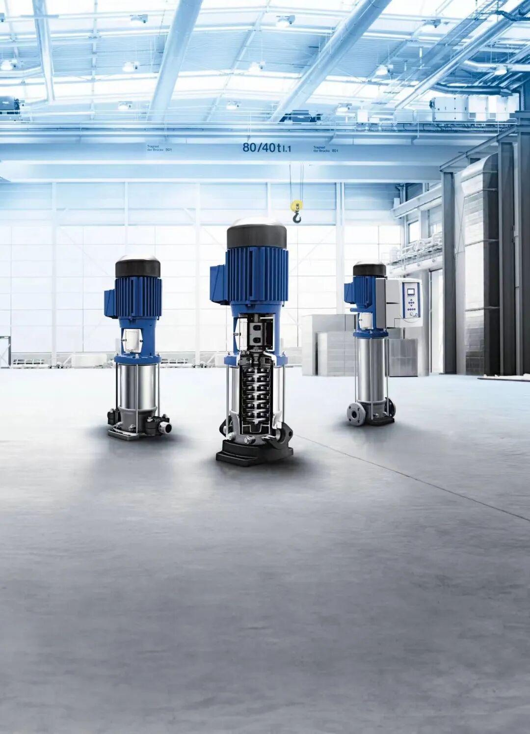 This vertical multi-stage high-pressure centrifugal pump features a segmented design with concentric suction and discharge ports of identical nominal diameter (pipe-type configuration), operating in direct-drive mode. It is equipped with a KSB SuPremE magnetless synchronous reluctance motor (IE4/IE5 energy efficiency rating per IEC TS 60034-30-2:2016 standard), except for the 0.55 kW/0.75 kW model with 1500 rpm speed that incorporates permanent magnets. The pump is driven by a KSB PumpDrive 2 or KSB PumpDrive 2 Eco speed control system with a rotorless position encoder. Its mounting points comply with EN 50347 standards, while the housing dimensions meet DIN V 42673 (07-2011) specifications. An ATEX-rated version is available upon request.