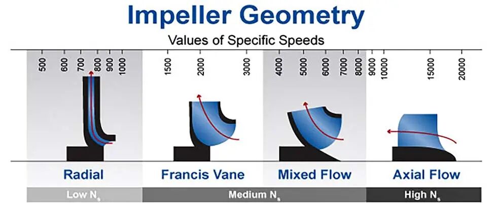 Si le liquide pénètre dans la turbine parallèlement à l'axe central de l'arbre et le quitte à un angle de 90 degrés (perpendiculaire) par rapport à l'axe central de l'arbre, la turbine se trouve dans la plage de vitesse spécifique basse.