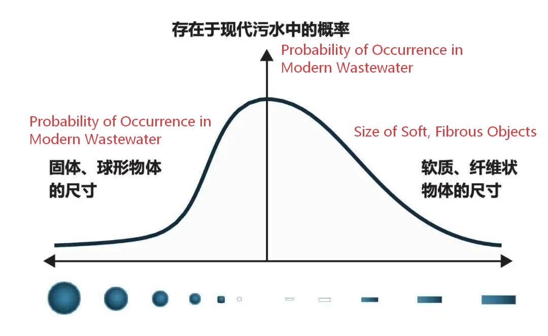La figure 1 illustre conceptuellement la probabilité de trouver différents types de solides dans les eaux usées. Les objets durs, presque sphériques, se trouvent à gauche, tandis que les objets mous et allongés se trouvent à droite. Comme dans de nombreux systèmes, la probabilité de trouver de très gros objets (sphériques ou allongés) est très faible. Une caractéristique importante est l'asymétrie de la courbe de distribution : elle favorise les objets mous et allongés, qui sont les plus courants dans les eaux usées actuelles.