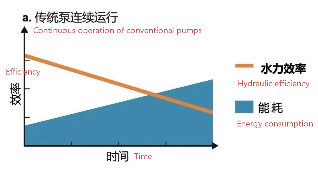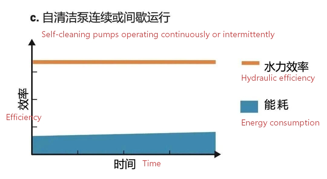 Comme le montre la figure 11a, lorsque la pompe conventionnelle fonctionne en continu dans les eaux usées, son efficacité diminue et sa consommation d'énergie augmente progressivement. La même tendance est observée lorsque la pompe conventionnelle fonctionne par intermittence (figure 11b), même si le lavage à contre-courant peut améliorer temporairement l'efficacité. En revanche, la figure 11c montre que la pompe autonettoyante maintient une efficacité et une consommation d'énergie constantes en fonctionnement continu ou intermittent dans les eaux usées, ce qui se traduit par la consommation d'énergie la plus faible au fil du temps.