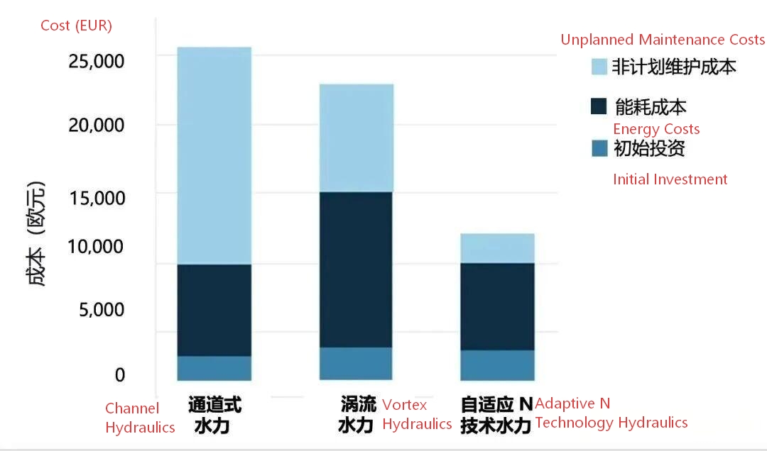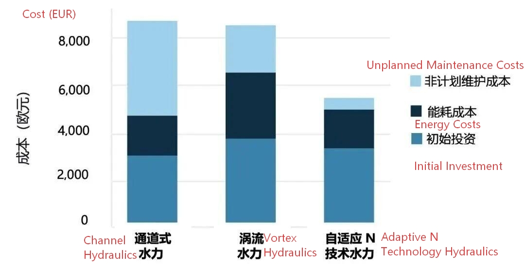 Lorsqu'une pompe à turbine à canal fonctionne 12 heures par jour pendant cinq ans (figure 14), ses coûts de maintenance non planifiée sont cinq fois supérieurs à l'investissement initial. En revanche, les coûts de maintenance de la pompe à turbine adaptative de type N ne représentent que 60 % de son investissement initial. Si les pompes à turbine vortex nécessitent généralement moins d'entretien que les pompes à turbine à canal, leur rendement inférieur à celui des autres conceptions hydrauliques entraînera des coûts énergétiques plus élevés. Ce chiffre ne tient même pas compte des coûts énergétiques supplémentaires liés au colmatage progressif, difficile à prévoir et donc non inclus dans le calcul du coût du cycle de vie ni dans ces graphiques. Compte tenu de cela, la pompe hydraulique vortex aura une consommation énergétique supérieure à celle des deux autres conceptions hydrauliques.